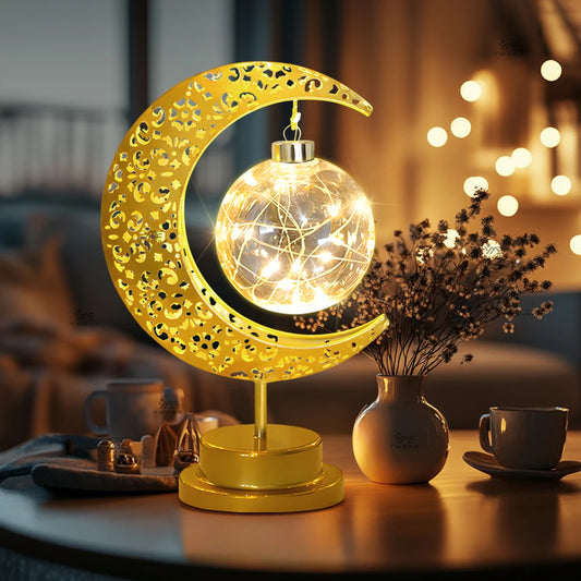 LED Moon Lamp – Golden Crescent Decorative Table Lamp with Hanging Star | Warm White Fairy Light Night Lamp