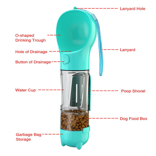 4 in1 Portable Cat Dog Water Bottle Feeder Drinker Poop Bag Dispenser
