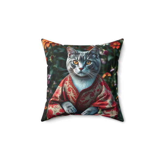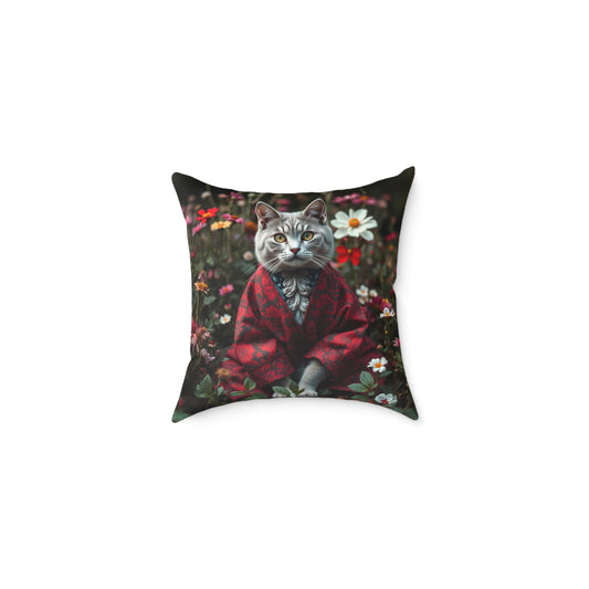 William Morris Style Cat in Kimono and Flowers Square Pillow, Botanicals and Flowers, insert included