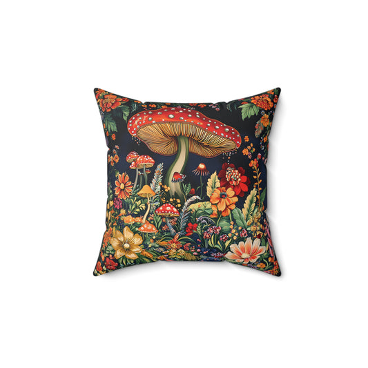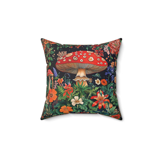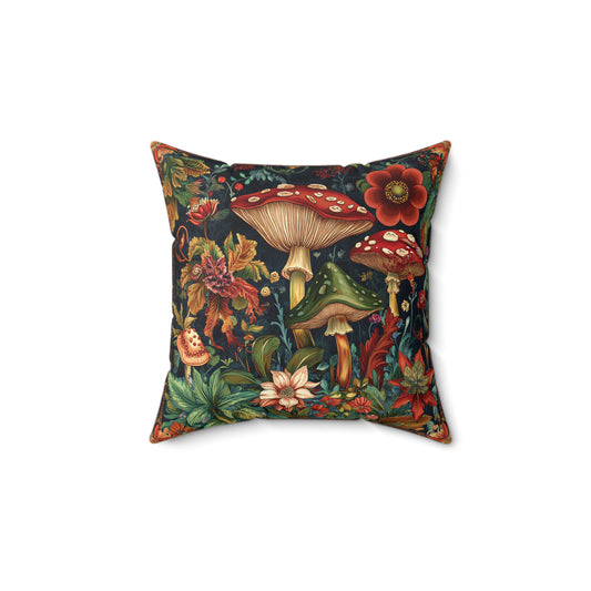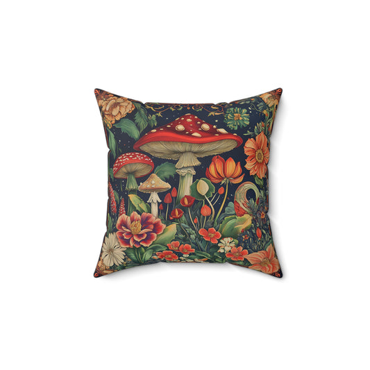 William Morris Style Mushroom and Botanicals Square Pillow, Red Toadstool Mushroom and Flowers, insert included