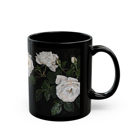White Rose Flowers Coffee Mug, Black Coffee Cup, White Flowers Tea Cup, Gift for Her, 11oz