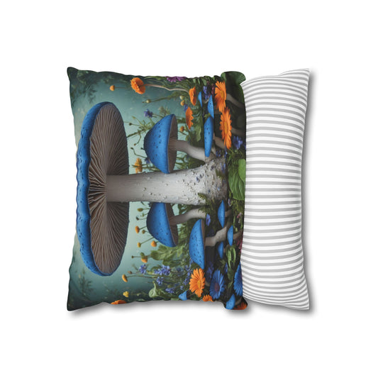 Blue Mushroom Square Pillowcase, Mushroom Decor, Cottagecore Pillowcase, Flowers and Mushroom, Mystical Mushroom Haven