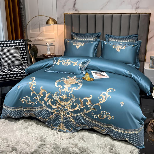 Blue Luxury Glossy Cotton Bedding Set with Royal Gold Embroidery , 400TC