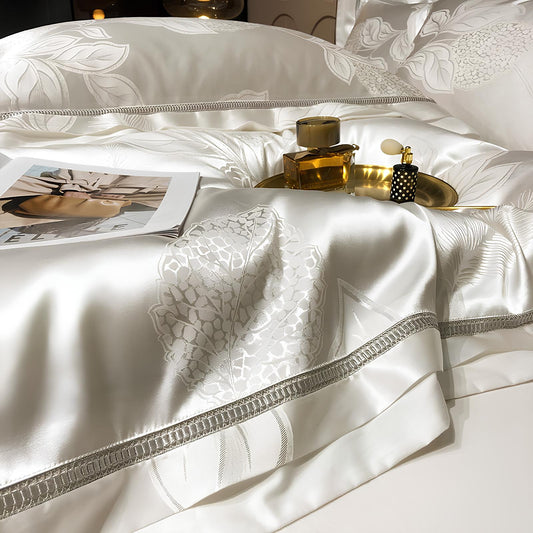 Beige - White Luxury Royal Gold Embroidery Glossy Cotton Bedding Set, 400TC