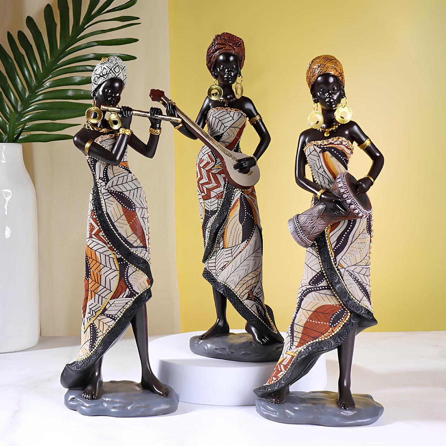 Inspired by the rich heritage of African music and artistry, our figurine depicts three women musicians immersed in the joyous melodies of their instruments. With fluid movements and dynamic poses, each figure exudes grace and vitality, creating a sense of harmony and unity among the ensemble.